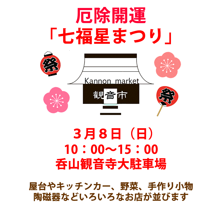 ただ今、「春季大祭七福星まつり 観音市」「桜まつり春の観音市」を募集しております。
