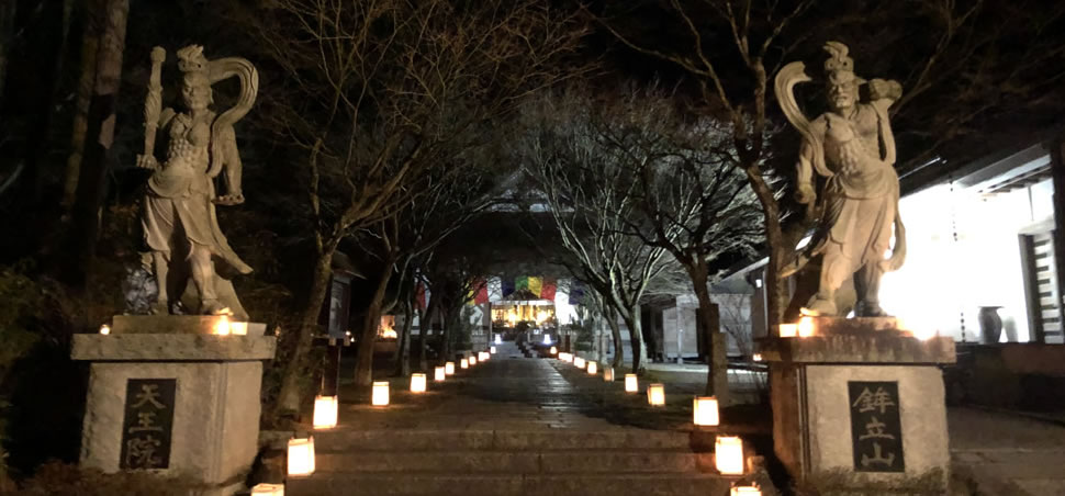 ライトアップされたお堂や瑜祇大宝塔、灯篭や竹明りの厳かな雰囲気の中、除夜の鐘を聴いて、一年の厄を落として、新年の開運をお祈り下さい。